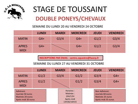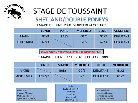 Centre Equestre La Montagne http://celamontagne.ffe.com http://wordpress.org/?v=2.3.2 fr Actualités http://celamontagne.ffe.com/?cs=08523114839d8f9869f9c9f8fd8670e2bd8478dfec8d8cc97ca1646695cf8014679e0f2d3c6e2b950ac4175375d36d6f5c8347271af6f1825b0a398cece4f72b809811b5f562a432fa599c93b9185dbcd8a53aba16eebbdfa89356fd83e1140a6eac5166931eb3e96400d6792e2d5523 http://celamontagne.ffe.com/?cs=08523114839d8f9869f9c9f8fd8670e2bd8478dfec8d8cc97ca1646695cf8014679e0f2d3c6e2b950ac4175375d36d6f5c8347271af6f1825b0a398cece4f72b809811b5f562a432fa599c93b9185dbcd8a53aba16eebbdfa89356fd83e1140a6eac5166931eb3e96400d6792e2d5523 Vous trouverez dans rubrique "Vie du Club" le programme des stages de la TOUSSAINT